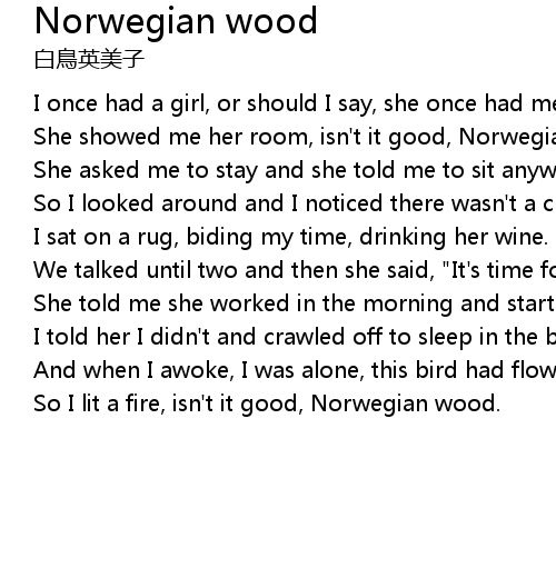 Norwegian Wood (This Bird Has Flown), Provided to YouTube by Universal Music Group Norwegian Wood (This Bird Has Flown) · The Beatles Rubber Soul ℗ 2009 . We Have got 5 images about Norwegian Wood Lyrics images, photos, pictures, backgrounds, and more. In such page, we additionally have number of images out there. Such as png, jpg, animated gifs, pic art, symbol, blackandwhite, pic, etc. "Norwegian Wood - Official Trailer", The official trailer for director Anh Hung Tran's adaptation of Haruki Murakami's bestselling novel Norwegian Wood. The film . "Deva Premal & Miten- Norwegian Wood with Lyrics !", ..